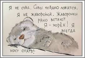 Я сова, насиловавщая себя всю мою родительскую жизнь. Сейчас, когда дети выросли, наслаждаюсь по выходным подъемом без будильника - часа на 3 позже, чем в будни, вместе с совой-мужем:)