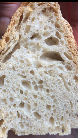 Вот такой в разрезе. Тяжелый очень, маленький кусочек съела,он камнем упал,корка и нижняя и верхняя толстая,на ощупь - влажный. Вчера поиск выдал,что причина может быть в лишней влаге и не нужно хлеб заворачивать после духовки. Я в льняное полотенце оба раза заворачивала.