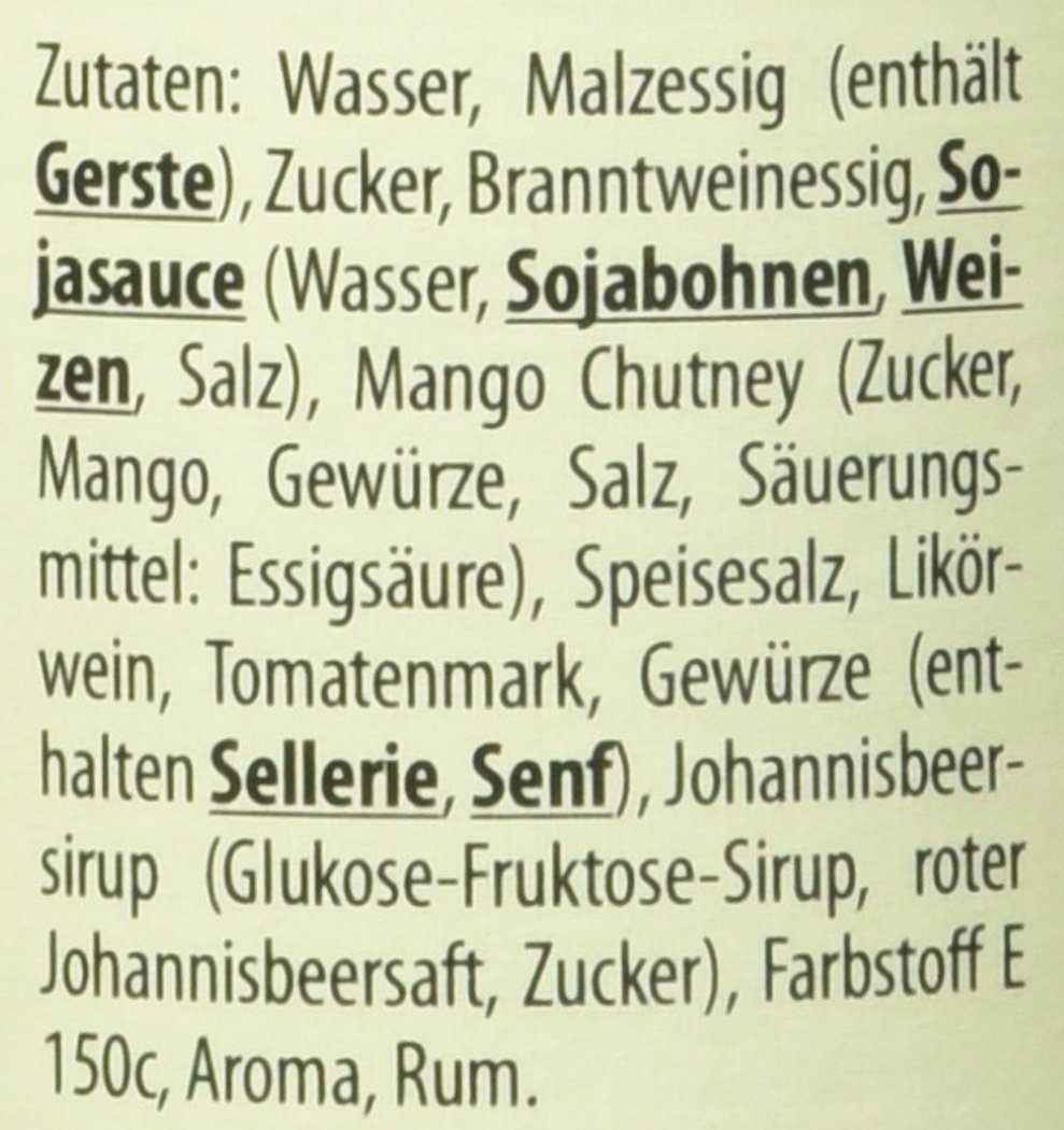Zutaten: Wasser, Malzessig (enthält GERSTE), Zucker, Branntweinessig, SOJASAUCE (Wasser, SOJABOHNEN, WEIZEN, Salz), Mango Chutney (Zucker, Mango, Gewürze, Salz, Säuerungsmittel: Essigsäure), Speisesalz, Likörwein, Tomatenmark, Gewürze (enthalten SELLERIE, SENF), Johannisbeersirup (Glukose-Fruktose-Sirup, roter Johannisbeersaft, Zucker), Farbstoff E 150c, Aroma, Rum.