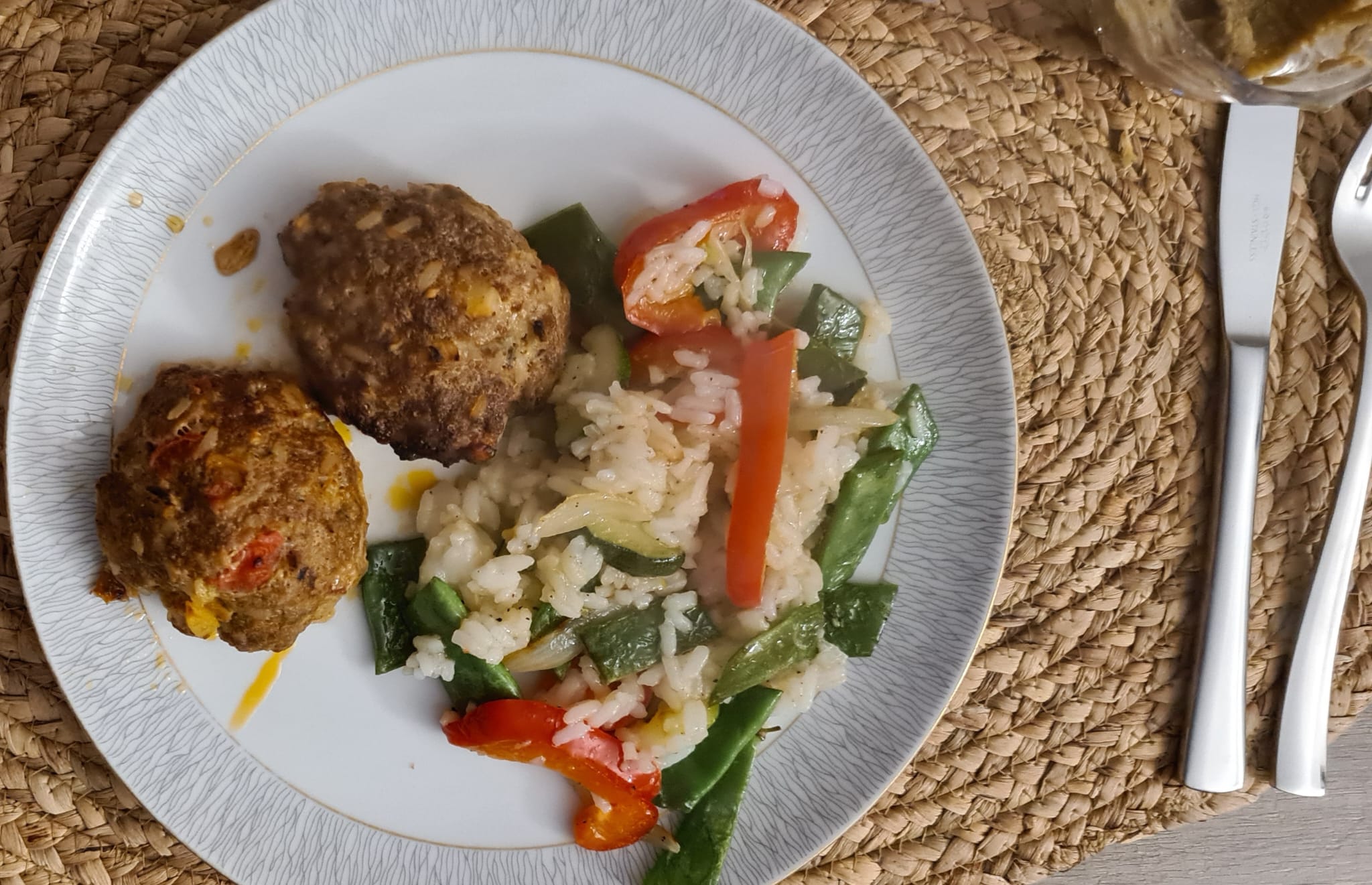 На обед были куриные оладьи с картофельным пюре и овощной салат. На ужин роллы заказала.