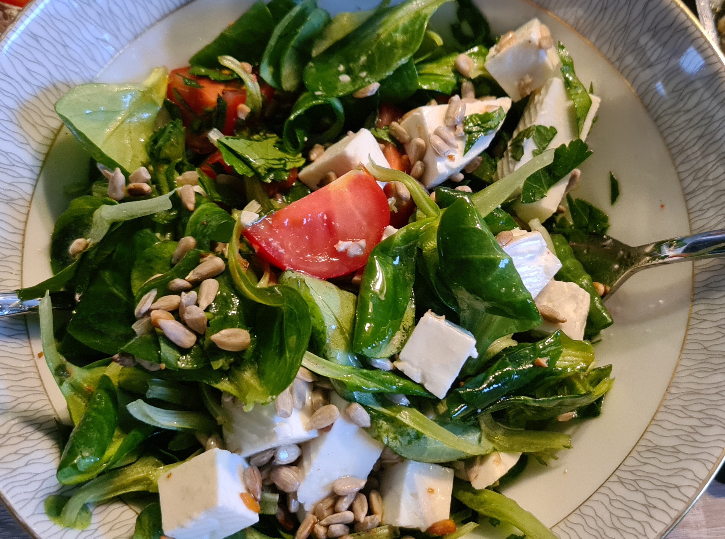 На самом деле это тарелка мужа, на моей всего в два раза меньше, кроме салатных листьев, их в два раза больше, просто для фото эта тарелка выглядела наряднее :)