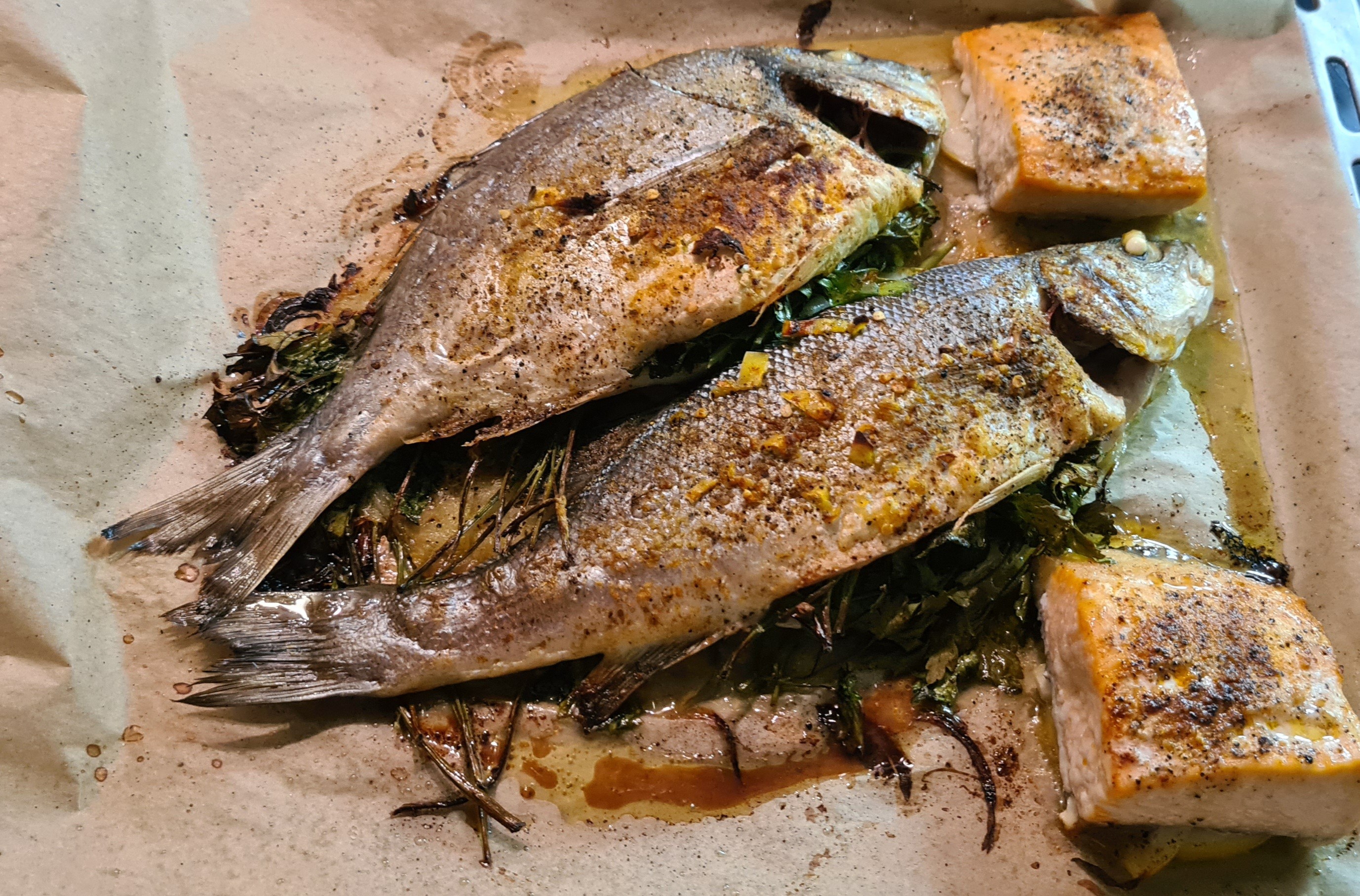 Да, рыба в духовке. При 180 градусов с обдувом (смотрите по своей духовке, м.б. меньше/больше нужно).