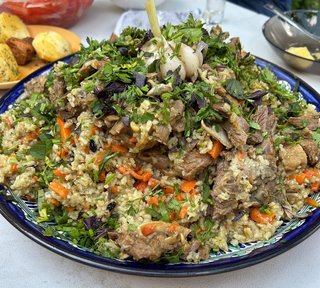 Вчера приготовила острый бараний суп в казане на мангале. Детям грибной суп. На полянки молоко и домашнее печенье. Вечером мясное ассорти на решетке и салат из овощей-гриль. Красное вино.