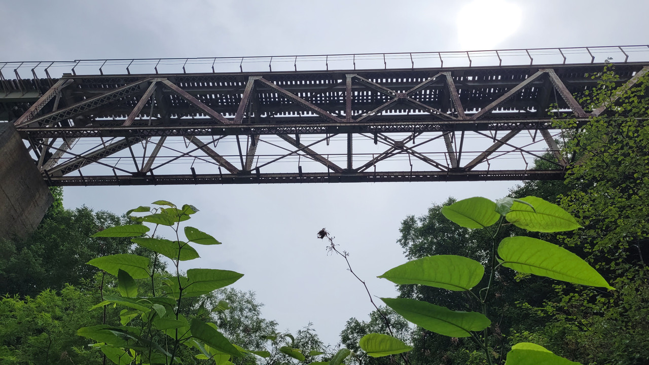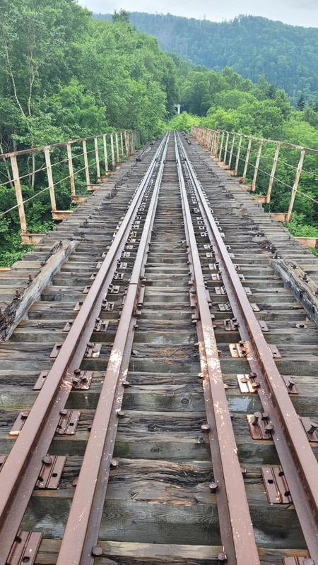 Тут поезд въезжат в туннель в горе, туннель идёт петлей, поезд разворачивается на 90 градусов и заезжает на мост.