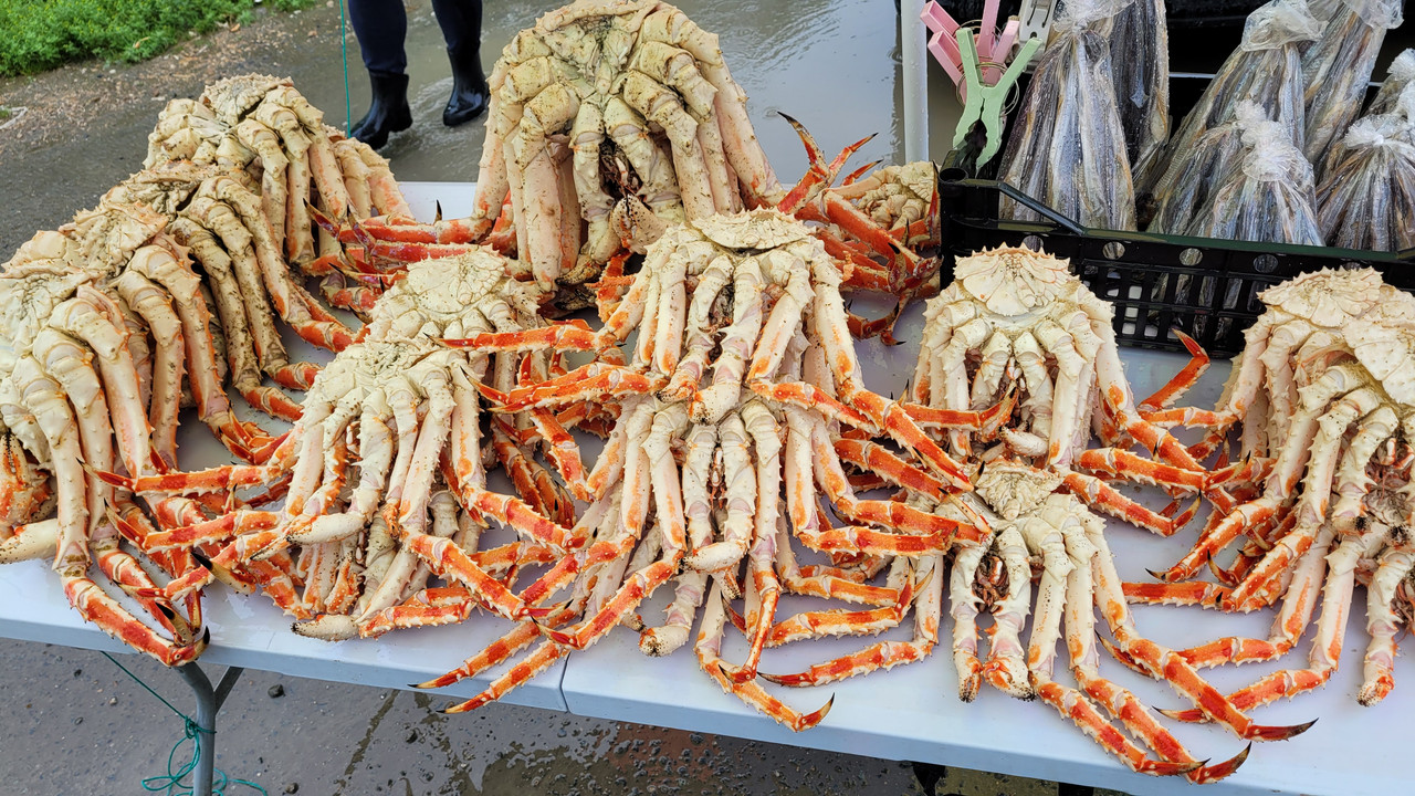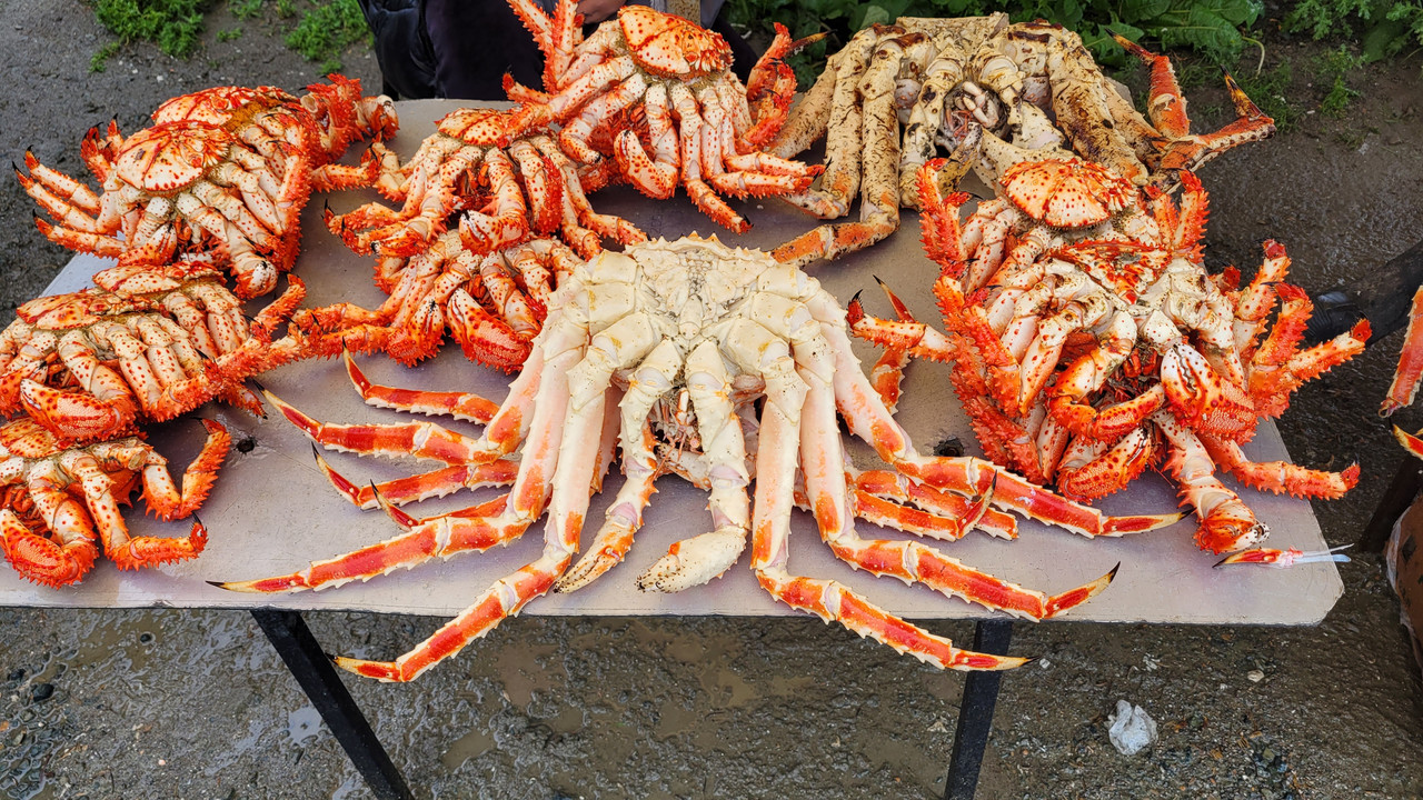 Значит самый огромный Камчатский по 5 тыр за тушу. Мы им объелись в четвером (пятый у нас такое не ест и радостно точит хитрый местный доширак).