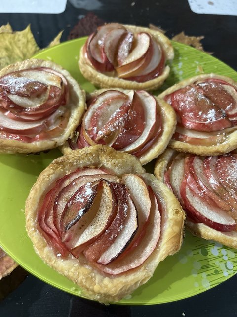 Я делаю из слоеного теста бездрожжевого или конвертики или просто чисто диетические цветочки. Мои не очень любят вообще что-то из яблок, кроме сырых яблок, но это лопают с удовольствием.