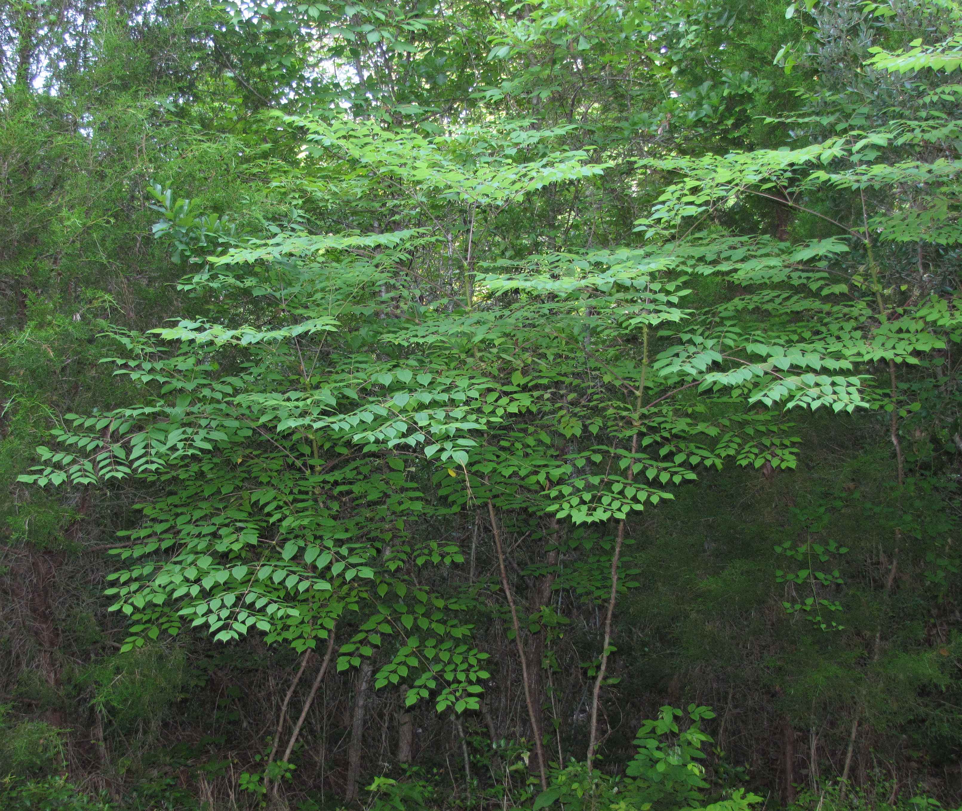 Я до сих пор видела его вживую растущим только в 2 местах: один в Ричмонд Хилле на одном фронт-ярде и второй в Брамптоне посреди клумбы на паблик проперти. У них такой экзотически-тропический вид благодаря их огромным листьям (каждый листик вырастает на полтора метра в длину и все дерево имеет вид гигантского древовидного папоротника - легко представить себе например, жирафа или динозавра под ним). Плюс огромные метелки белых цветов в конце лета (сейчас)... правда, он колючий страшно и пускает сакерсы, но это я переживу -все мы не без недостатков.